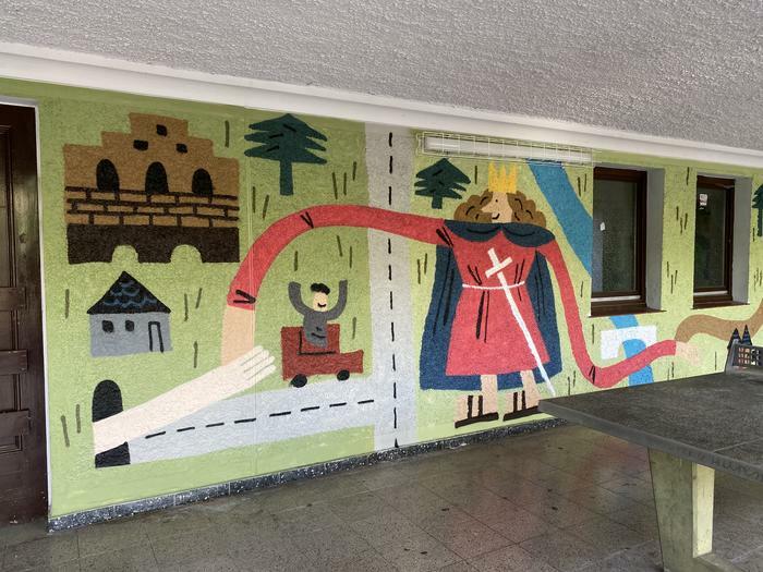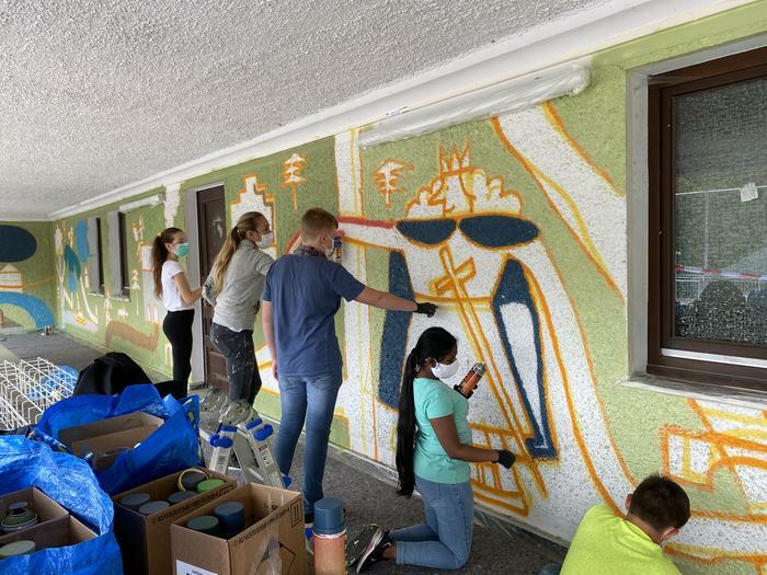 Im Rahmen des Projekts „Altena gemeinsam gestalten“ haben Kinder unterschiedlichen Alters eine großflächige Wand auf dem öffentlich zugänglichen Schulhof neu gestaltet. Zusammen mit einem erfahrenen Graffiti-Künstler entwickelten die Kinder Ideen für die Illustrationen, setzten diese um und sprayten das Graffiti-Bild an die Wand.