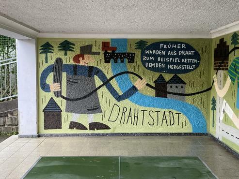 Im Rahmen des Projekts „Altena gemeinsam gestalten“ haben Kinder unterschiedlichen Alters eine großflächige Wand auf dem öffentlich zugänglichen Schulhof neu gestaltet. Zusammen mit einem erfahrenen Graffiti-Künstler entwickelten die Kinder Ideen für die Illustrationen, setzten diese um und sprayten das Graffiti-Bild an die Wand.