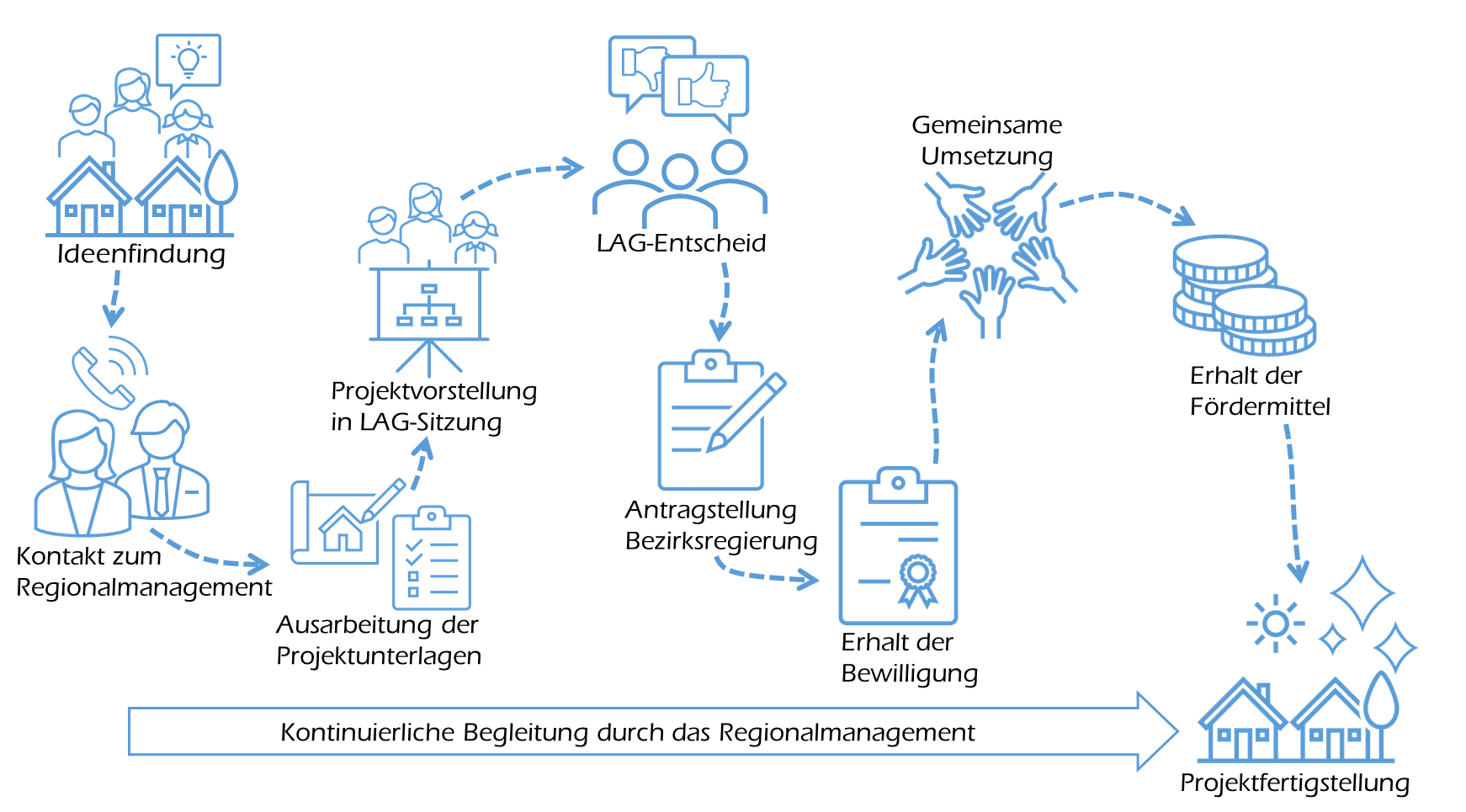 Nun beginnt die Umsetzungszeit Ihres Projekts! Neben Anschaffungen und Dienstleistungen können Sie auch eigene Arbeiten als Bürgerschaftliches Engagement (Eigenleistung) einbringen. Es werden ausschließlich Positionen umgesetzt, die zuvor auch beantragt wurden. Sollte es zu Änderungen z.B. im Kostenplan kommen, sprechen Sie bitte direkt mit dem Regionalmanagement. Gemeinsam wird die Änderung im Projekt bei der Bezirksregierung angemeldet.