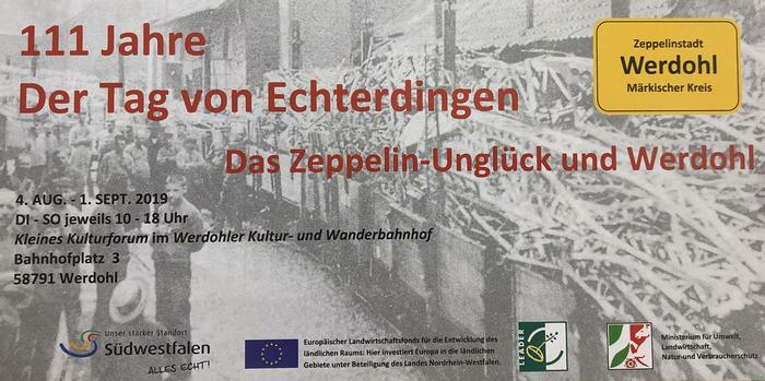 Vom 4. August bis 1. September findet im Kleinen Kulturforum im Werdohler Kulturbahnhof die Ausstellung "111 Jahre 'Der Tag von Echterdingen'. Das Zepplin-Unglück und Werdohl" statt. Die Öffnungszeiten sind Dienstags bis Sonntags von jeweils 10 bis 18 Uhr.