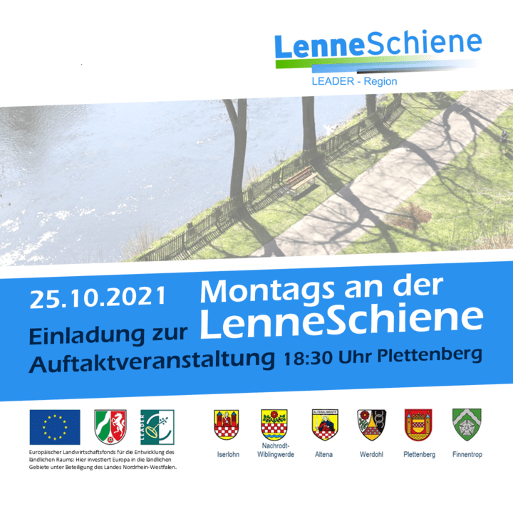 Gemeinsam bewerben sich die Städte und Gemeinden Iserlohn-Letmathe, Nachrodt-Wiblingwerde, Altena, Werdohl, Plettenberg und Finnentrop als LEADER-Region 2023-2027. Dazu laden wir Sie ein, Ihre Ideen für unsere Region LenneSchiene mit einzubringen!