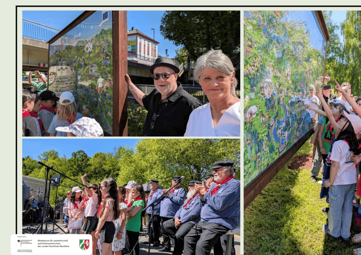 Am Maifeiertag wurde im Rahmen der gut besuchten Eröffnung der Werdohler Lennefontäne ein weiteres LEADER-Projekt offiziell vorgestellt: das Wimmelbild der LenneSchiene. Gemeinsam mit Bürgermeister Andreas Späinghaus, der Künstlerin Dorothee Reichenberger sowie Regionalmanagerin Sonja Büsing wurde das großformatige Kunstwerk enthüllt – gut sichtbar aufgestellt in Richtung Eisenbahnbrücke.